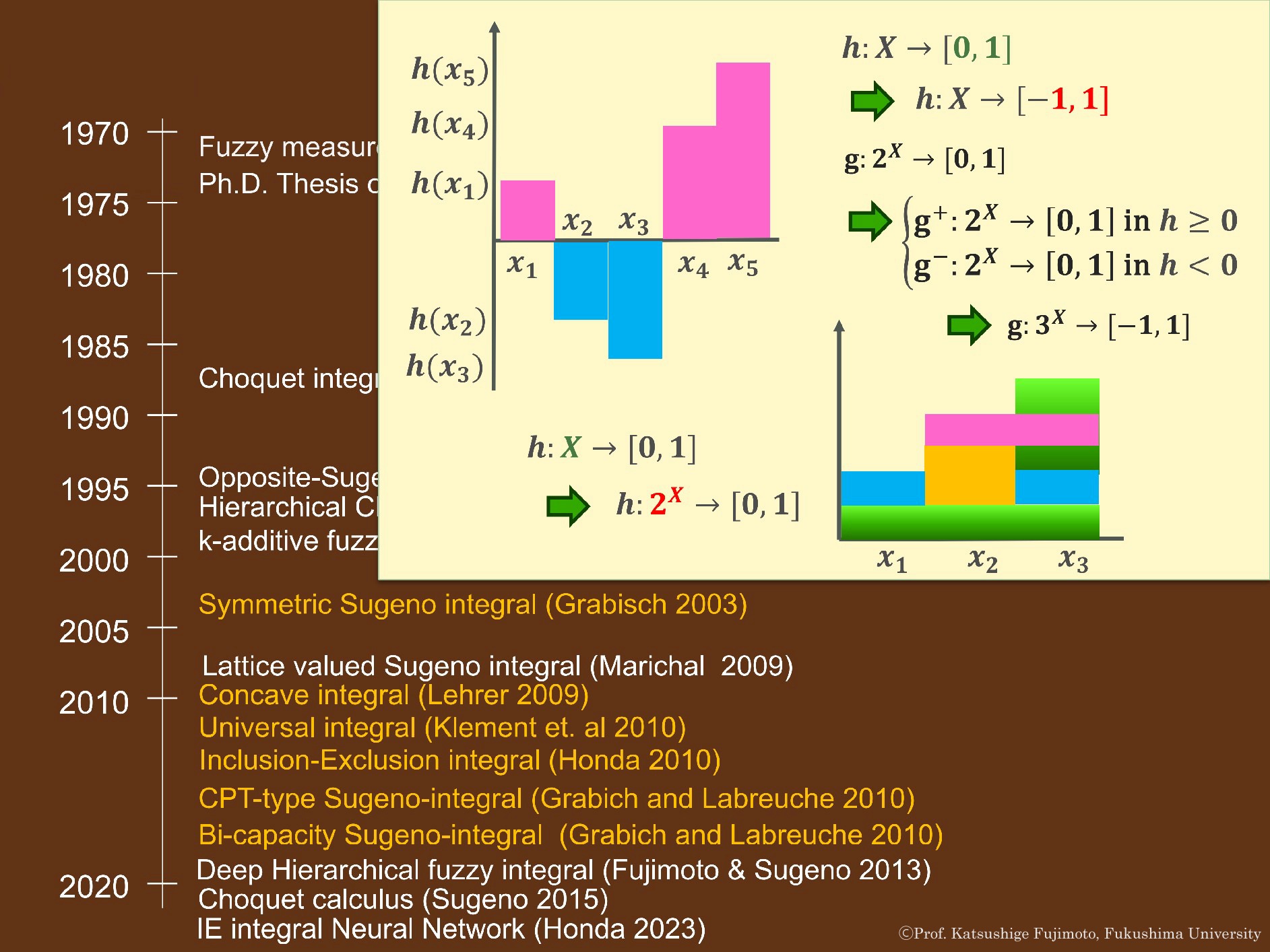 たとえば、正負の値をとる関数hのファジィ積分(下の画像の1つ目の矢印)、正・負の領域でそれぞれ異なるファジィ測度を用いるもの(2つ目の矢印)、関数hの正・負の領域の統合に用いる測度(3つ目の矢印)、関数hの領域XをXのべき集合へ拡張したもの(4つ目の矢印)