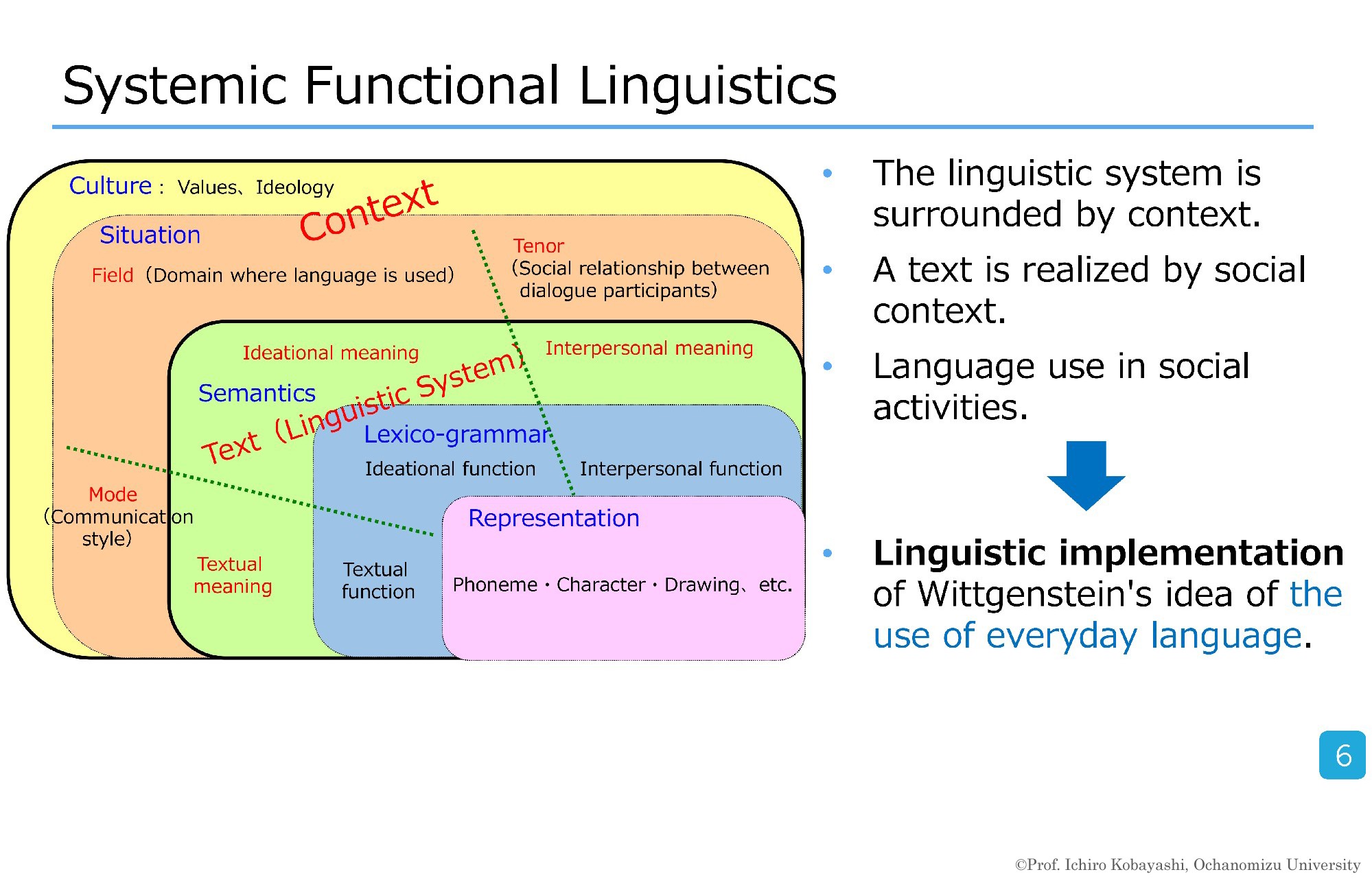 Systemic Functional Linguistics Theory has basic ideas for the use of language in social activities. These ideas correspond to the linguistic implementation of Wittgenstein's idea of the use of everyday language.
