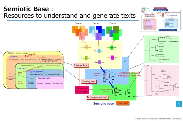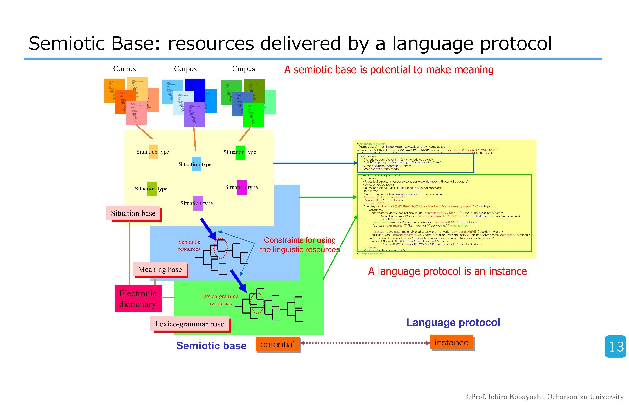 A semiotic base is like a knowledge base consisting of resources for understanding and generating language, but unlike a general knowledge base, it has the same structure as the linguistic system in SFL, with a hierarchical selection mechanism for language resources based on the situation. This is supposed to represent the use of language in social activities.