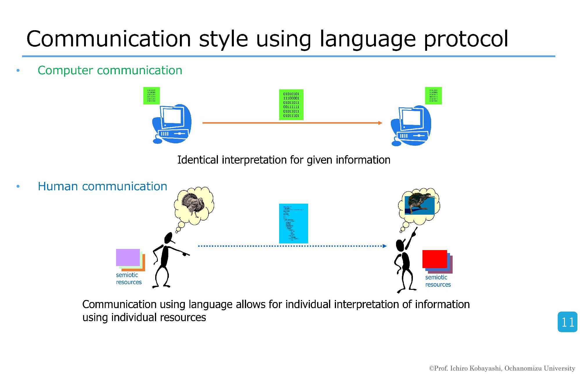 We proposed a communication standard called language protocol, that converts computer communication protocols into language. As for computer communication, identical interpretation for the given information is performed. On the other hand, human communication using language allows for individual interpretation of information using individual resources.