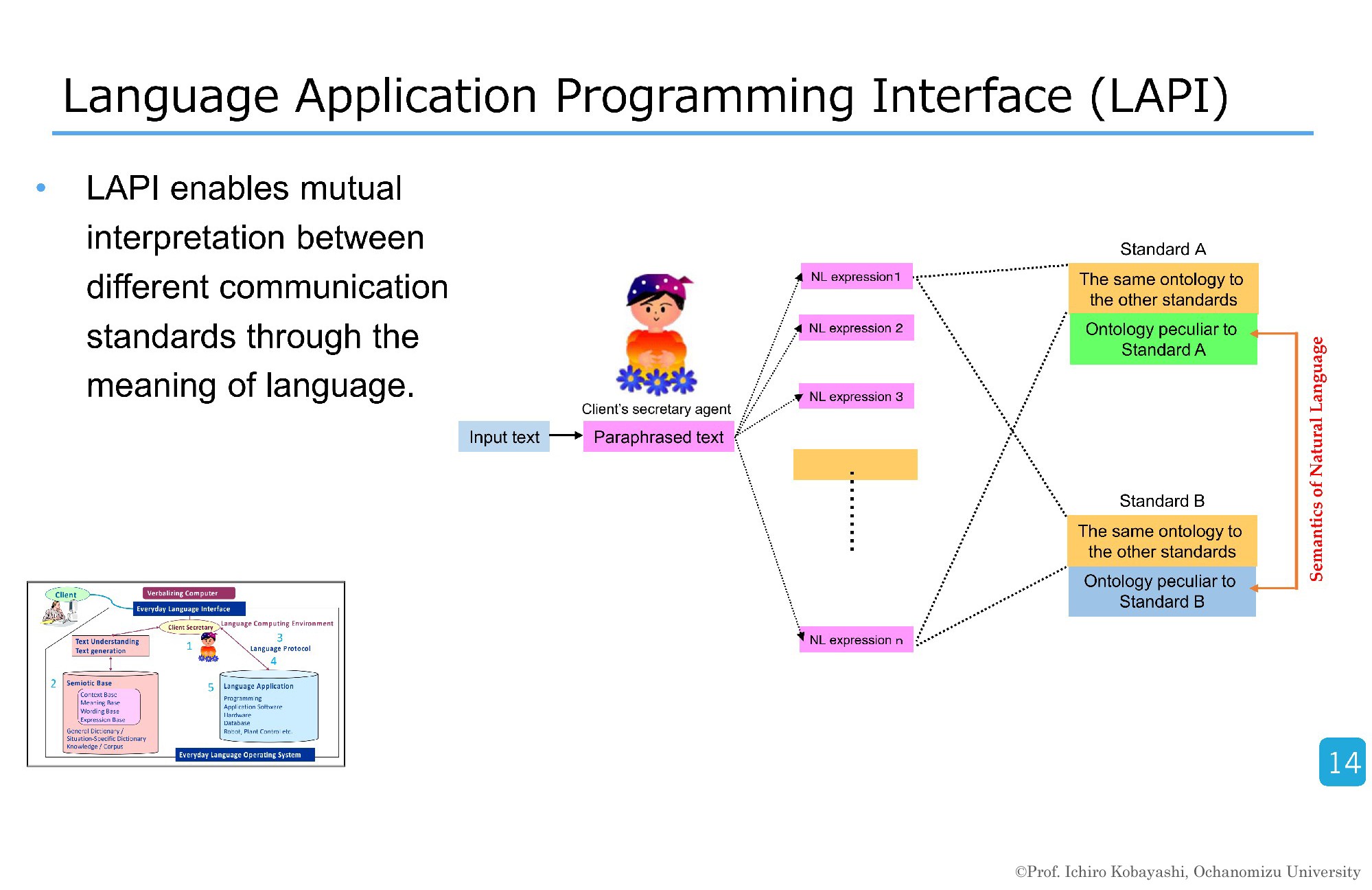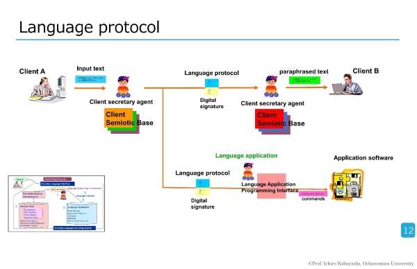 Language protocol enables a style of communication that relies on the recipient's interpretation of his or her statements. Statement, that is, input text is transformed into language protocol and it is interpreted by the Client B's secretary agent so that Client B can easily understands Client A's statements. As well as communication between humans, language protocol enables communication between human and application software or between application software. By changing all protocols into languages, communication can be established under the flexible semantic interpretation that languages have.