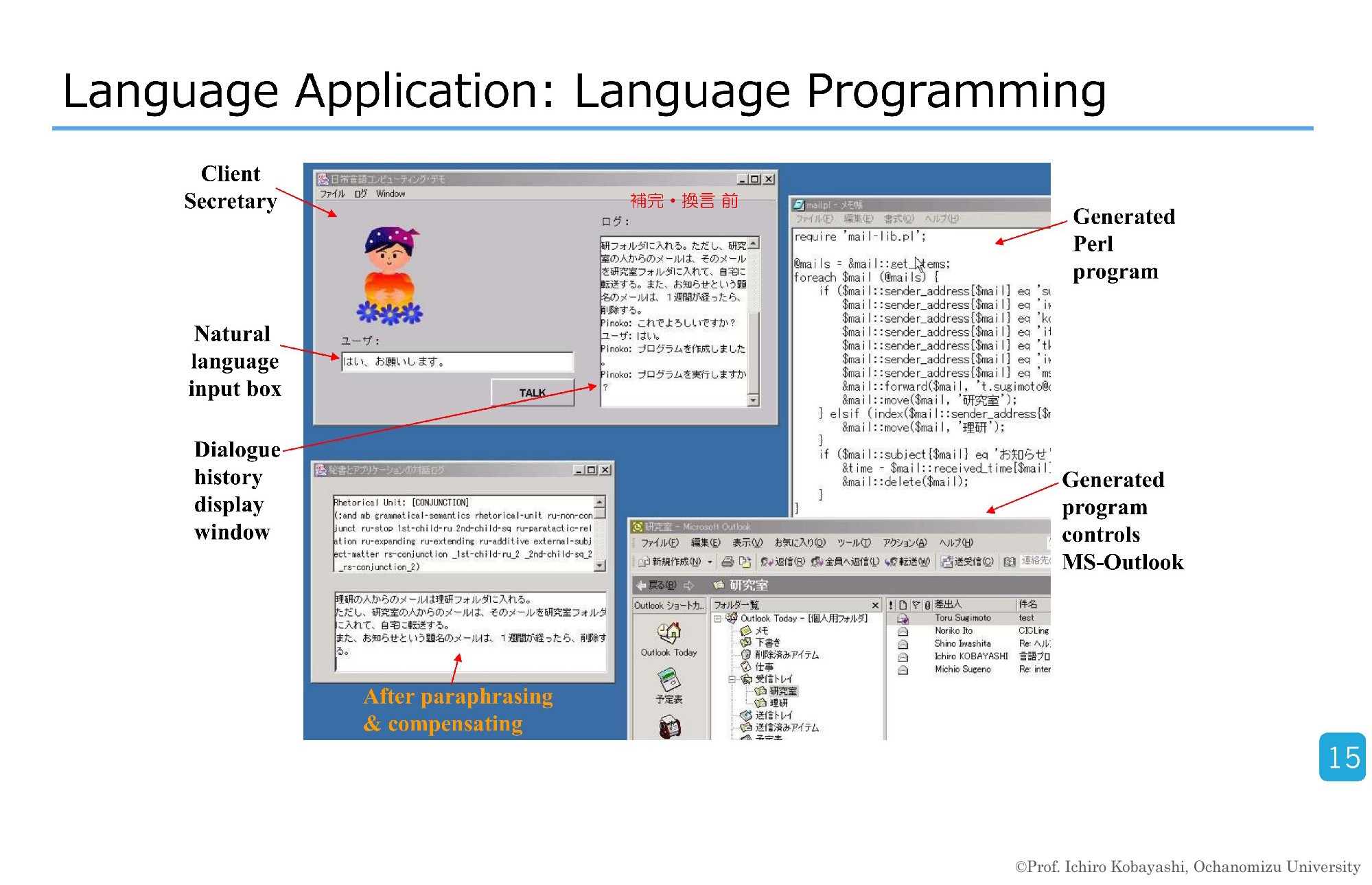 We have developed several applications that can be operated using language. This is the application that can make a computer program by language. Users can ask an agent called “Client secretary” to perform mailer operations using natural language. Client secretary understands the user's request from their speech, generates a program to operate the mailer, and manages emails by operating the mailer based on that program.