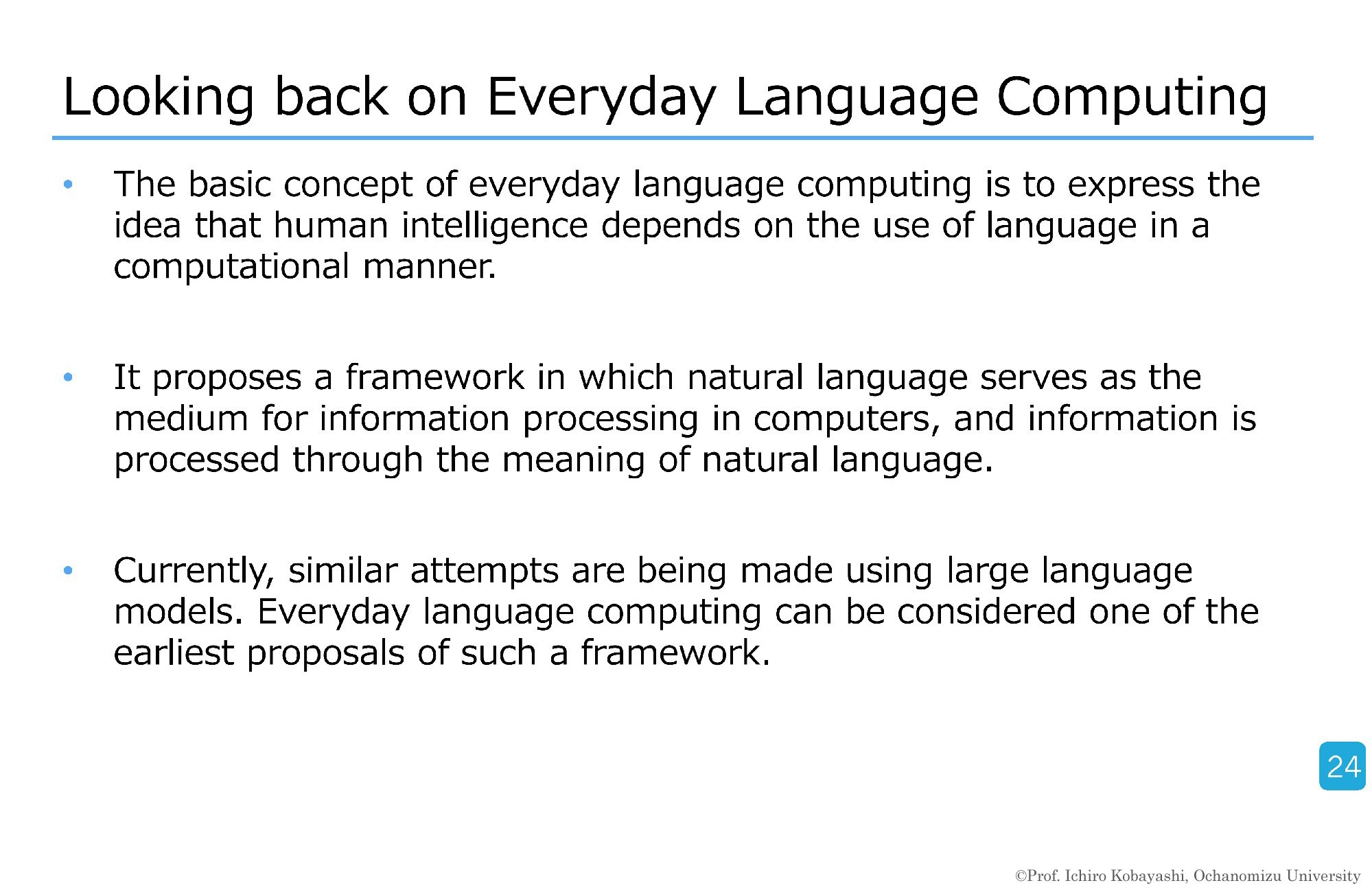 - Ichiro Kobayashi, “From Everyday Language Computing to Beyond”, in Envisioning the Future: Continuing the Legacy of Professor Michio Sugeno, Panel discussion at WCCI 2024, The IEEE World Congress on Computational Intelligence, Yokohama, Japan, June 30, 2024